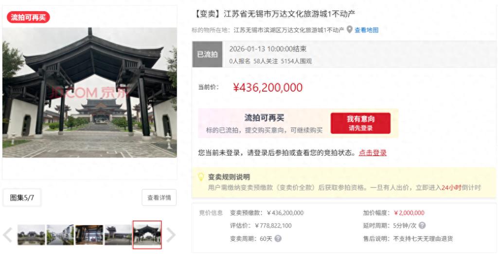 1月13日,据京东拍卖网披露的信息显示,江苏省无锡市万达文化旅游城1不动产因无人出价已流拍,起拍价为4.362亿元,评估价约7.78亿元。此前...